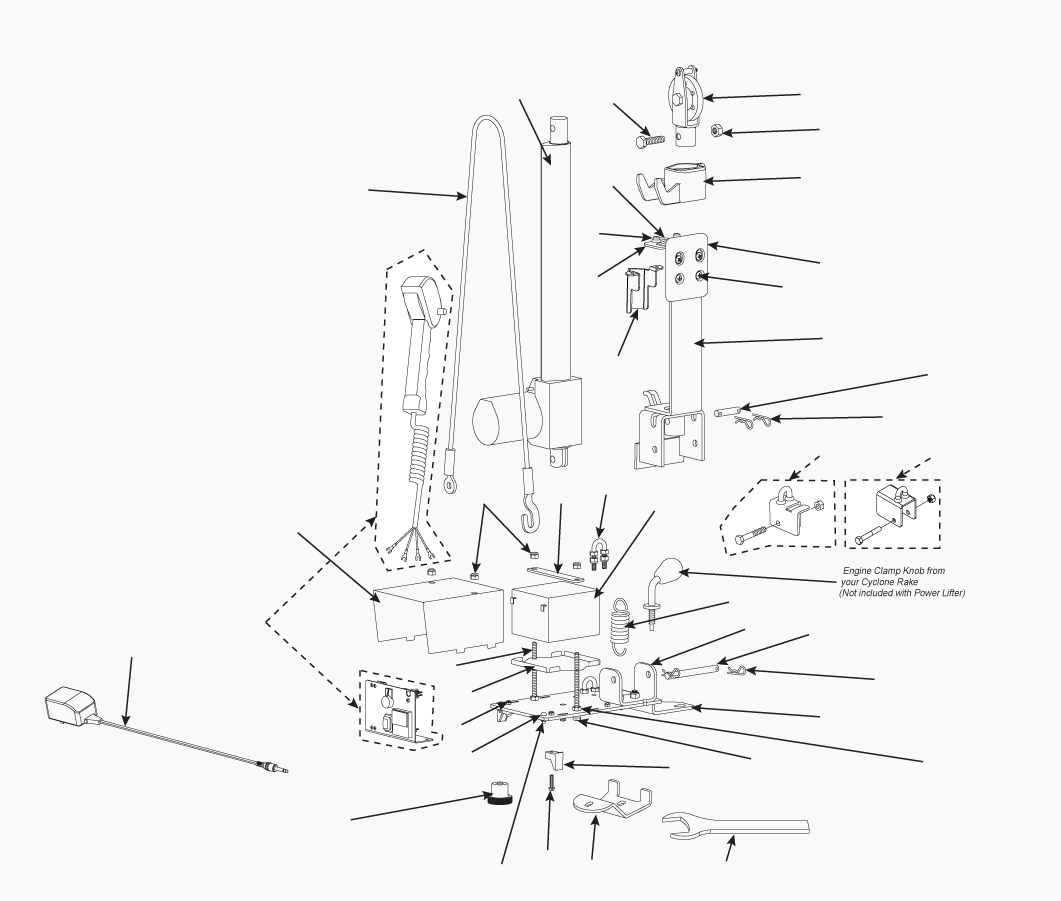 The Cyclone Rake’s Power-Lift Unloader is a technological marvel and a workhorse. From the diagram below you can see this is one of our more complex accessories. So, if you need any help figuring out what part you may need, please feel free to give our Product Technicians a ring.